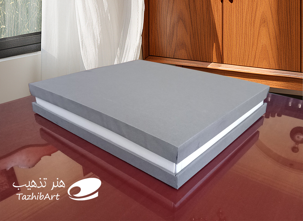 برای پروژههای تذهیب با جزئیات زیاد، مقوا به دلیل داشتن سطحی صاف و مقاومت بالاتر گزینهای مناسبتر است. با این حال، هنرمند برای افزایش دوام تابلوهای تذهیب، در تهیه بوم از ترکیب مقوا و فیبر چوبی استفاده کرده است. او مقوای فابریانو را با کمک چسب چوب به فیبر چوبی متصل کرده و برای اطمینان از صاف بودن سطح و جلوگیری از ایجاد حباب، با ابزار صافکننده مقوا را فشار داده است.