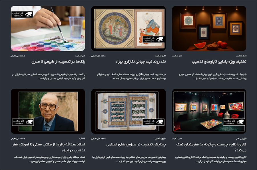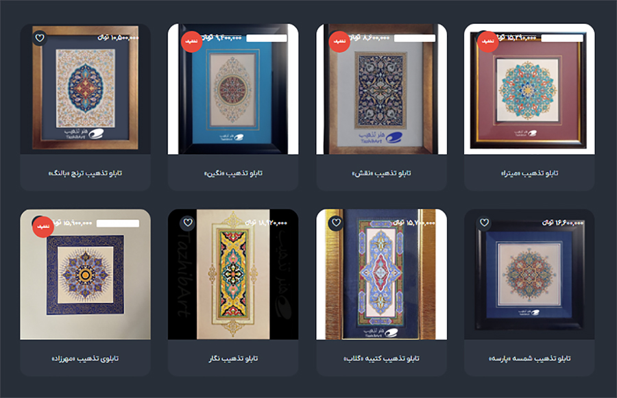 - ایجاد نمایشگاه مجازی دائمی از آثار تذهیب، تا مخاطبان بتوانند بدون محدودیت زمانی و مکانی با آثار او آشنا شوند. این بخش، هم فرصتی برای ارائه کارها و هم محلی برای فروش تابلوهای تذهیب است.